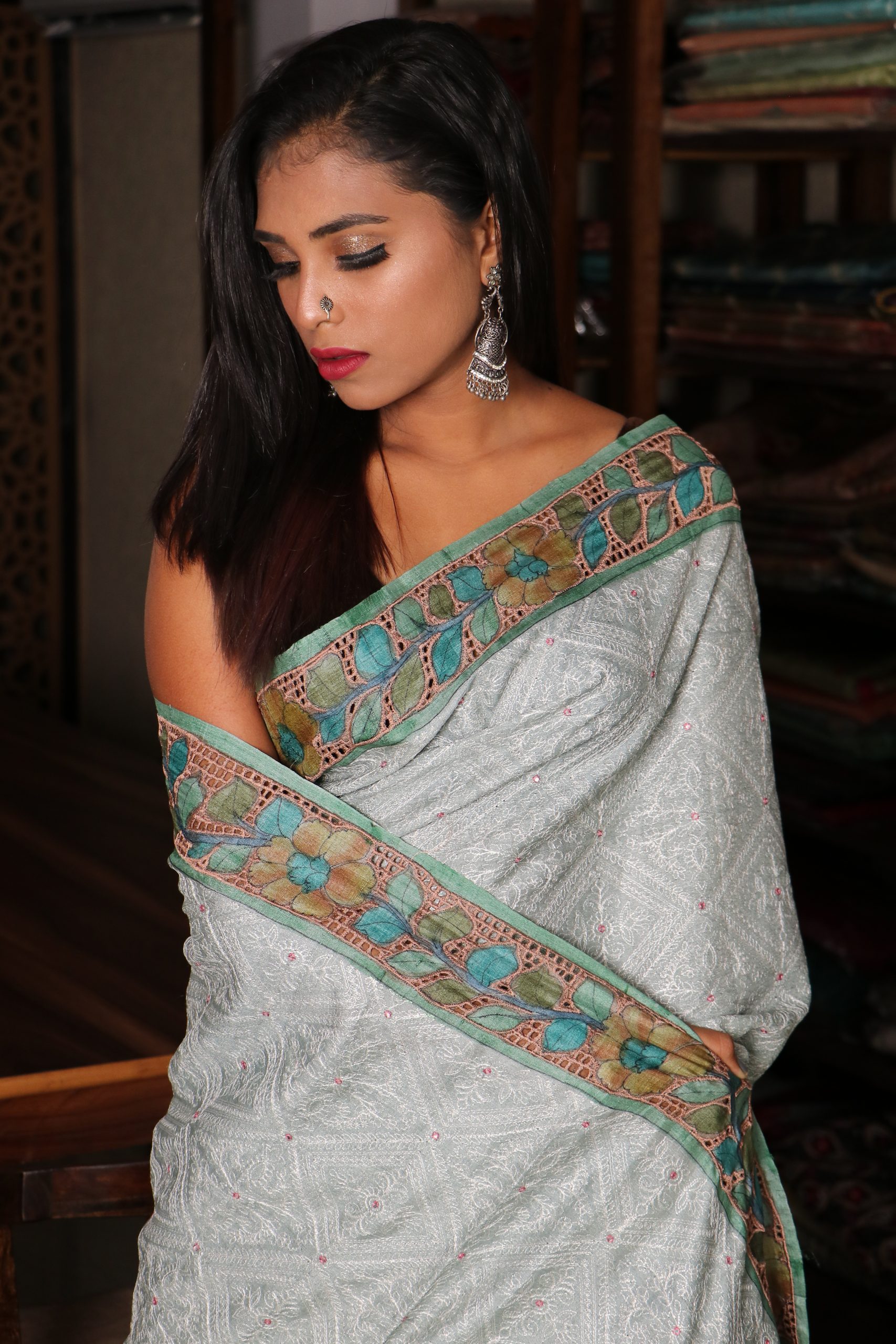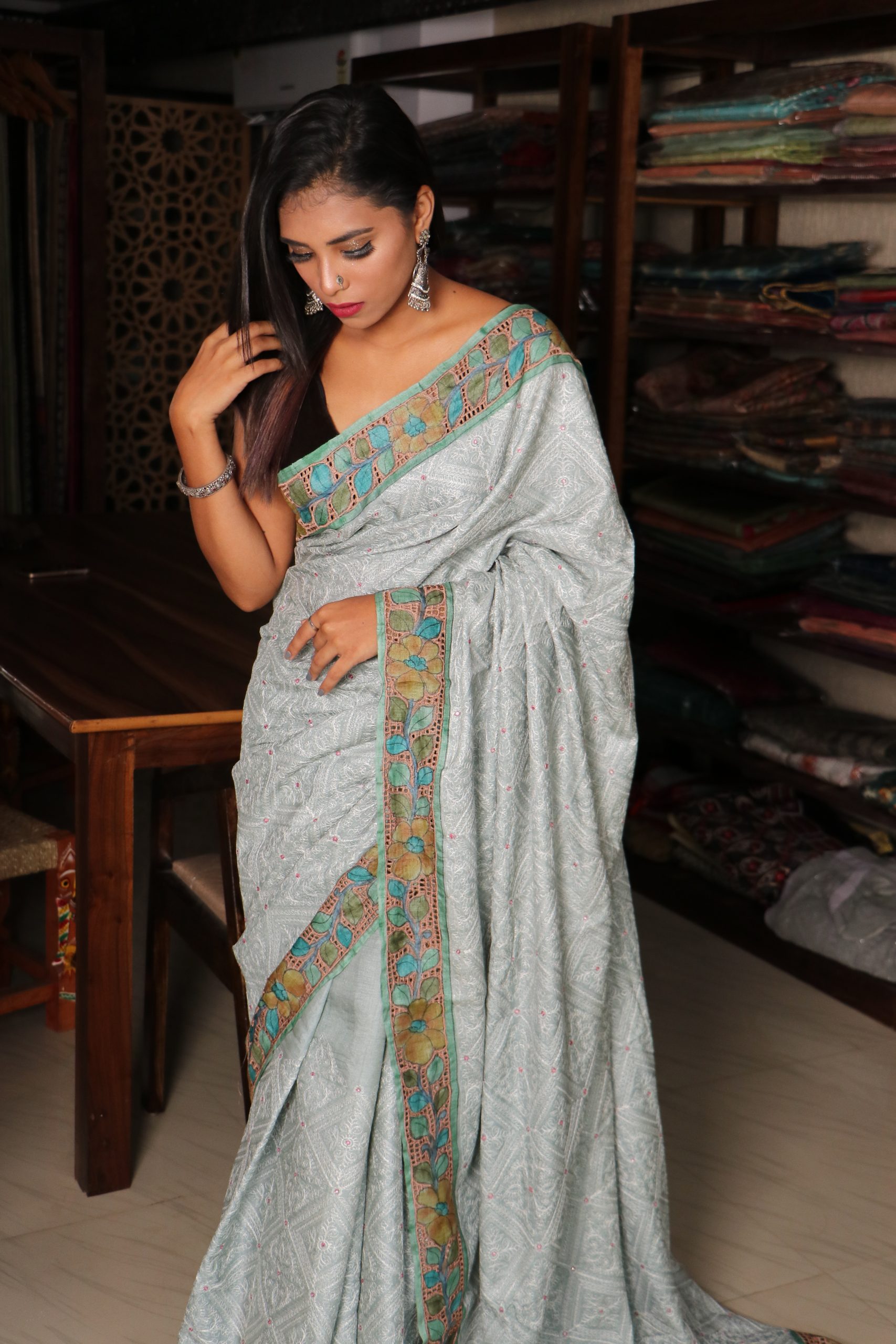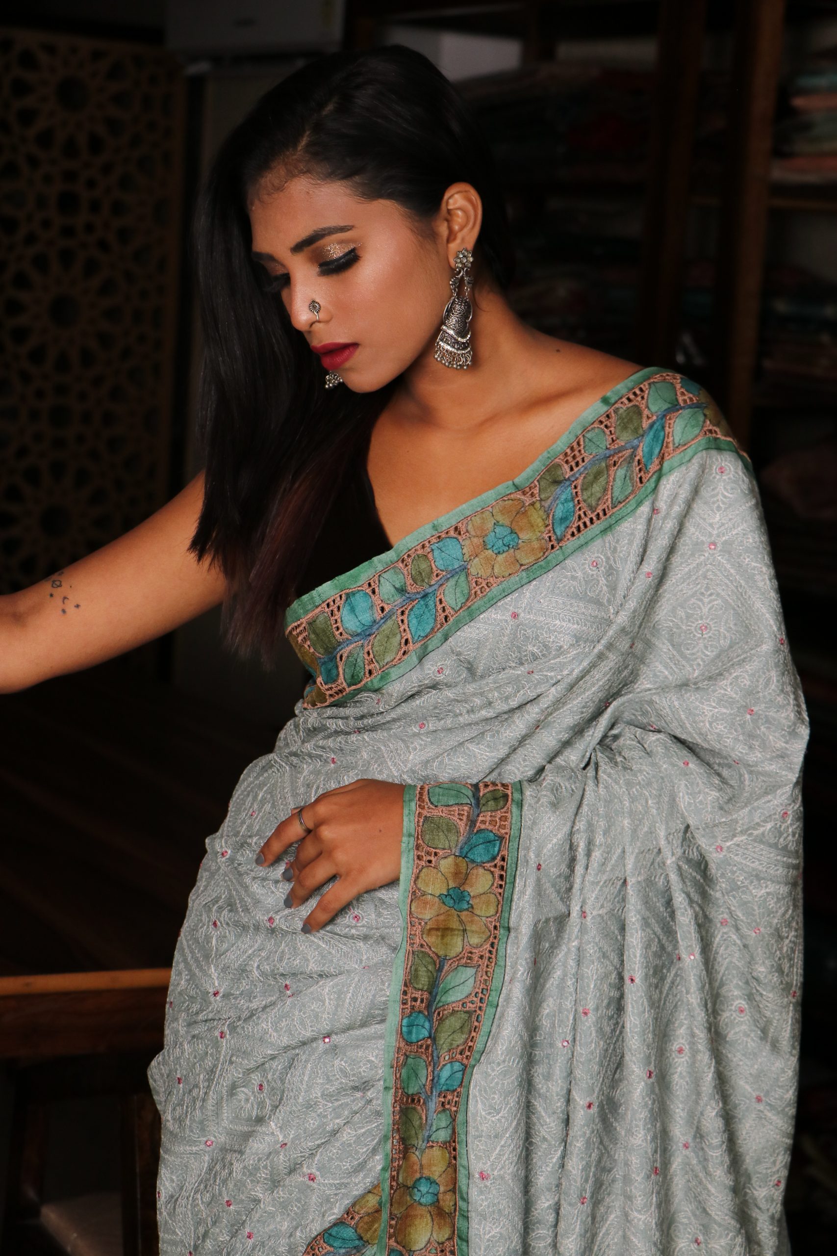 CHIKANKARI TUSSAR PEN KALAMKARI CUTWORK Saree