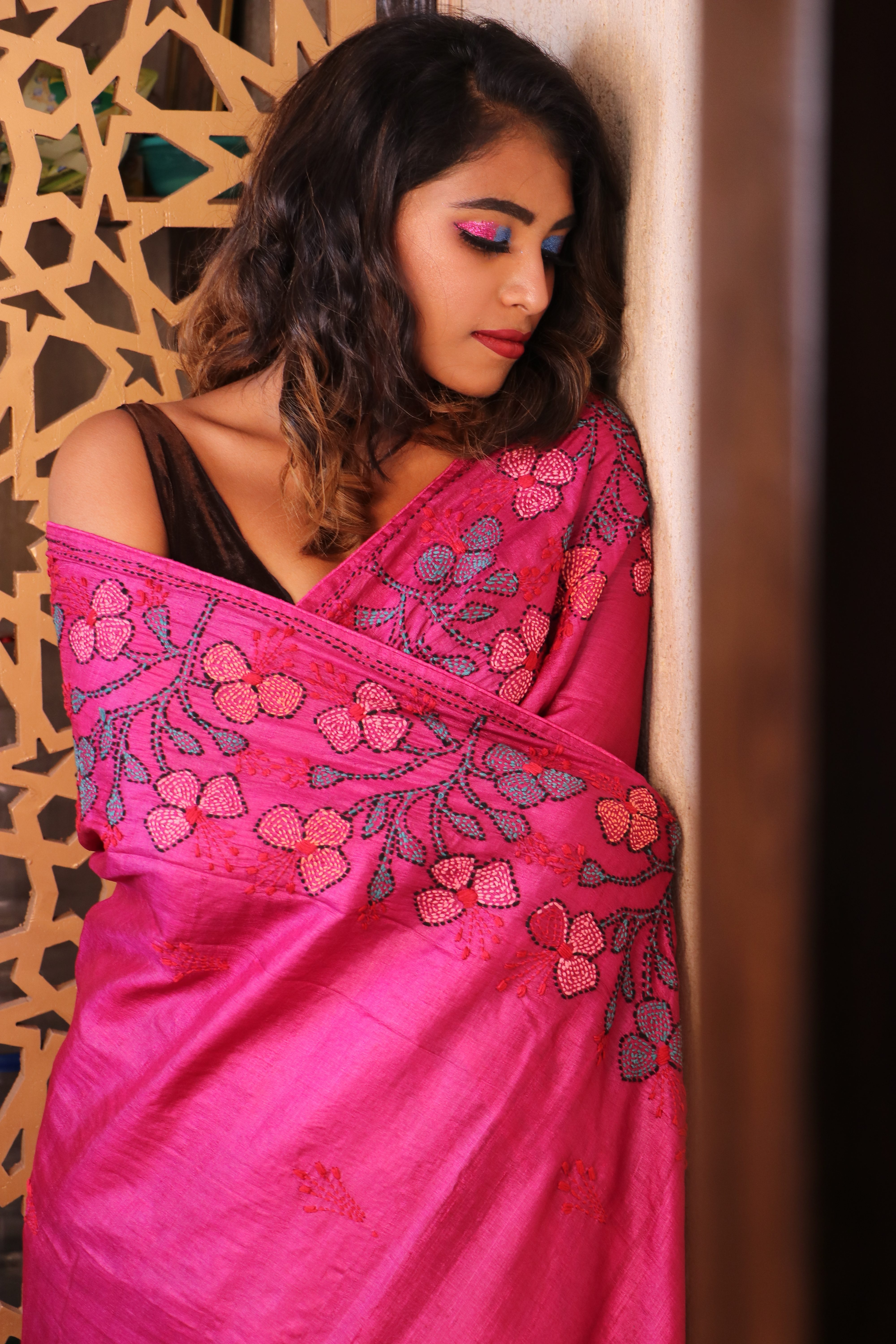 Absolutely Gorgeous Magenta Tussar with Hand Kantha Stitch