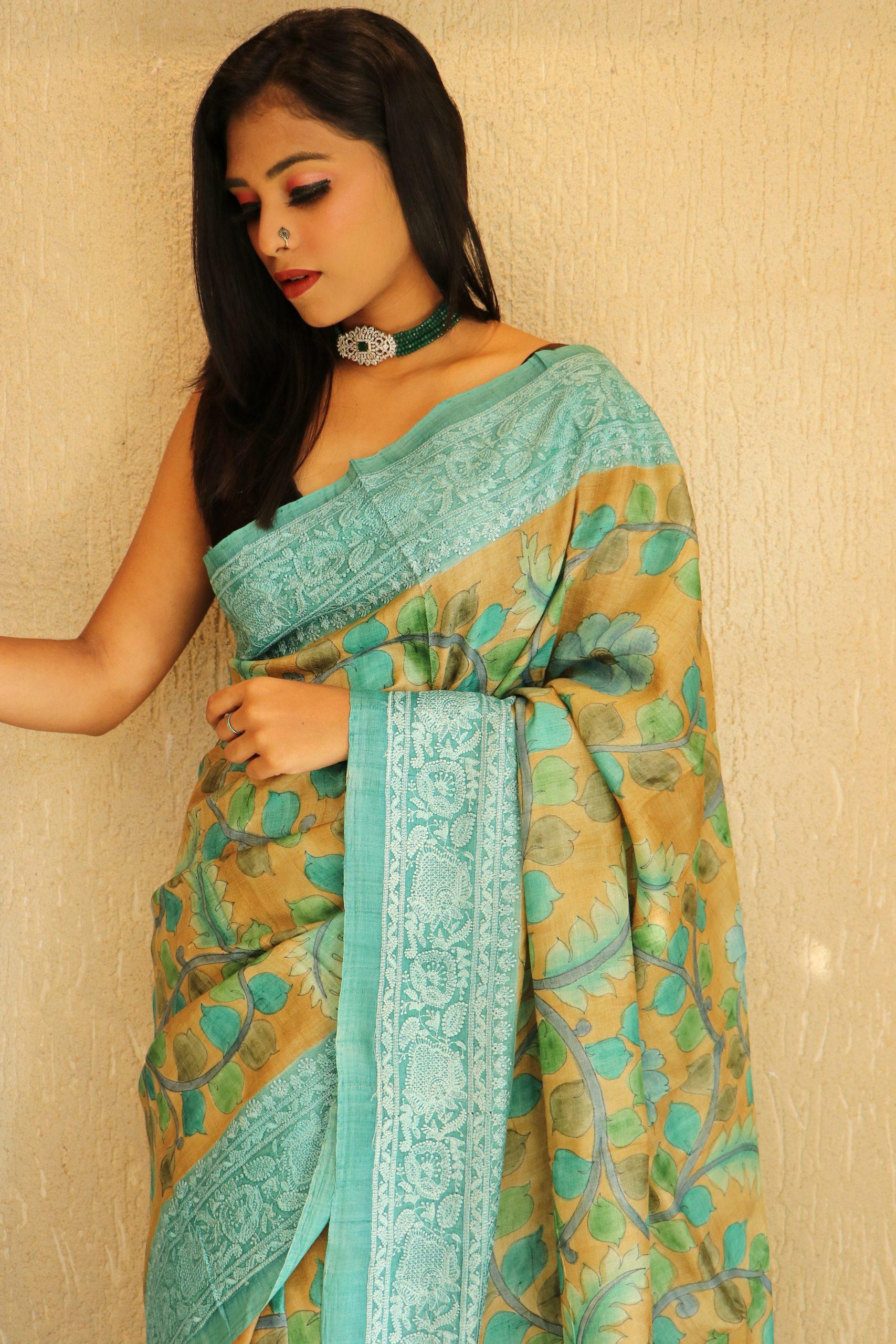 TUSSAR PEN KALAMKARI with CHIKANKARI BORDER WORK