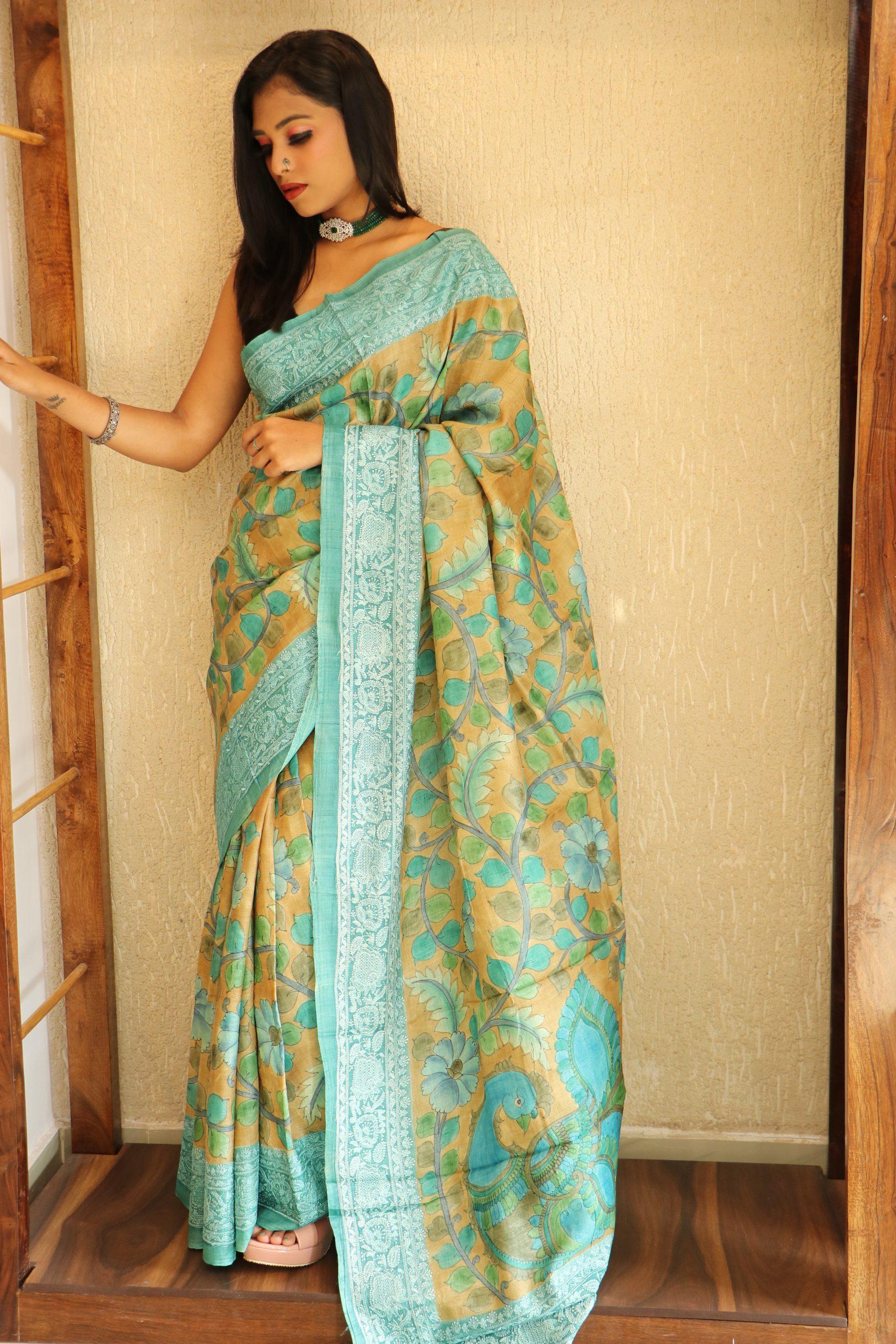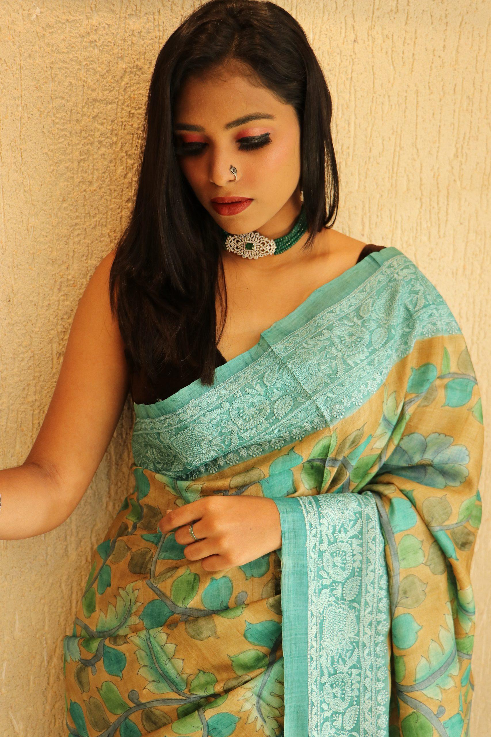 Absolutely Stunning Tussar pen kalamkari with chikankari border work saree
